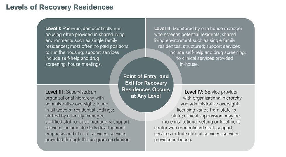 Level I Recovery Residences are often known as PEER-RUN RECOVERY RESIDENCES and are democratically run with no external supervision or oversight. Level I housing is often provided in shared environments such as single-family residences. Peer-run recovery residences give residents the ability to determine which arrangements will most effectively meet their needs. Level I support services include self-help services, drug screenings, and house meetings. Level I homes have the flexibility to make their own arrangements for medication management.